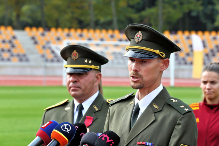 Zľava: Dosluhujúci riaditeľ VŠC Dukla Banská Bystrica Roman Benčík a nastávajúci riaditeľ VC Dukla Banská Bystrica Matej Tóth počas tlačovej konferencie v rámci slávnostného otvorenia zrekonštruovaného Atletického štadióna SNP Vojenského športového centra Dukla Banská Bystrica na Štiavničkách. Banská Bystrica, 5. október 2021. Foto: SITA/Peter Rusko