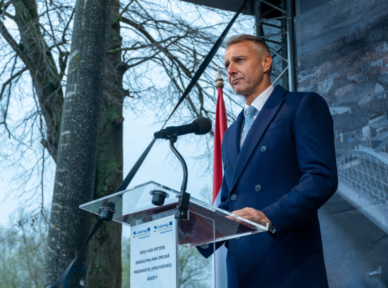 Minister investícií, regionálneho rozvoja a informatizácie SR Richard Raši v príhovore počas slávnostného otvorenia nového cestného Mosta sv. Barbory v Ipeľskom Predmostí, ktorý spája slovenskú obec Ipeľské Predmostie a maďarskú obec Drégelypalánk. Ipeľské Predmostie, 11. marec 2024. Foto: SITA/Ministerstvo investícií, regionálneho rozvoja a informatizácie SR
