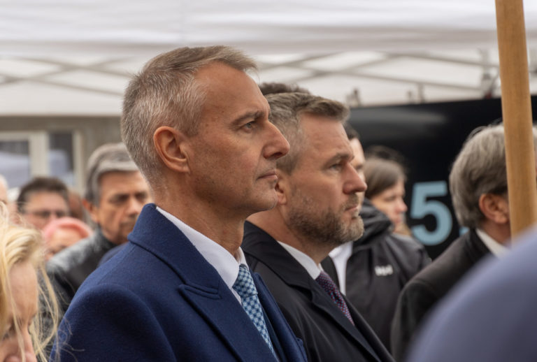 Predseda Národnej rady SR Peter Pellegrini v príhovore počas slávnostného otvorenia nového cestného Mosta sv. Barbory v Ipeľskom Predmostí, ktorý spája slovenskú obec Ipeľské Predmostie a maďarskú obec Drégelypalánk. Ipeľské Predmostie, 11. marec 2024. Foto: SITA/Ministerstvo investícií, regionálneho rozvoja a informatizácie SR