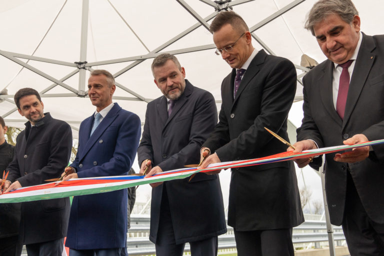 Uprostred zľava: Minister investícií, regionálneho rozvoja a informatizácie SR Richard Raši, predseda Národnej rady SR Peter Pellegrini a minister zahraničných vecí a obchodu Maďarska Péter Szijjártó prestrihávajú pásku počas slávnostného otvorenia nového cestného Mosta sv. Barbory v Ipeľskom Predmostí, ktorý spája slovenskú obec Ipeľské Predmostie a maďarskú obec Drégelypalánk. Ipeľské Predmostie, 11. marec 2024. Foto: SITA/Ministerstvo investícií, regionálneho rozvoja a informatizácie SR
