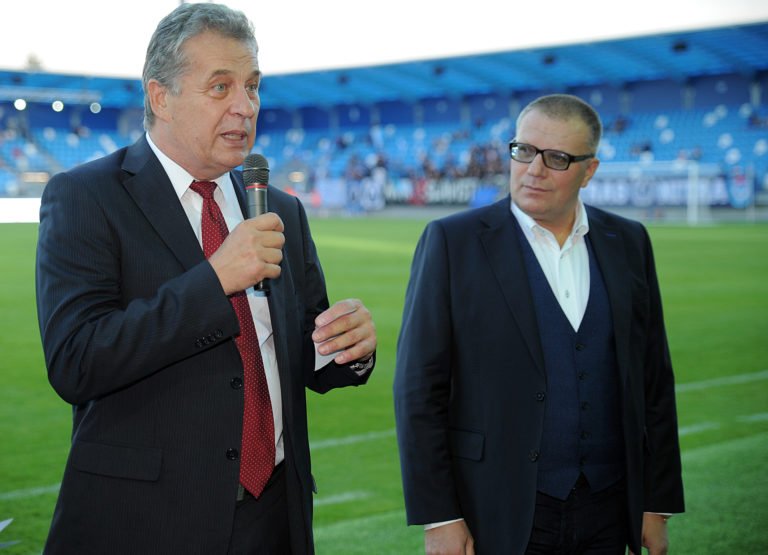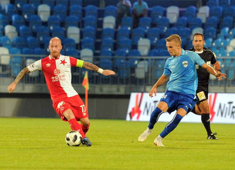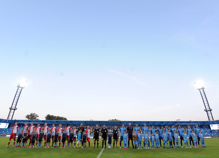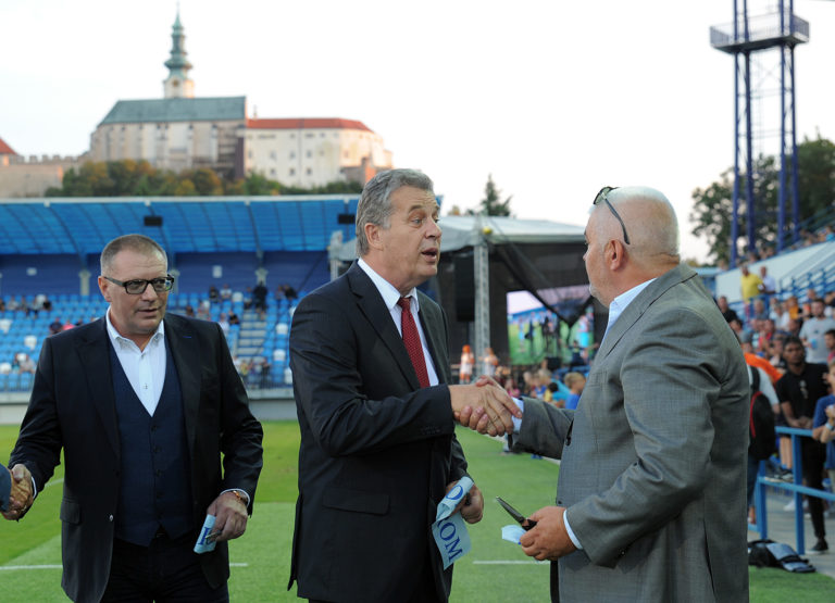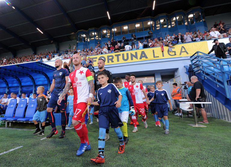 Zľava: Hráči SK Slávia Praha a FC Nitra pred vzájomným zápasom pri príležitosti otvorenia futbalového štadióna FC Nitra. Nitra, 7.9 2018. Foto: SITA/Martin Havran.