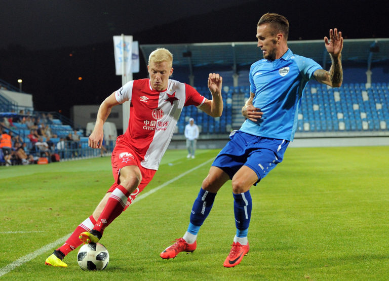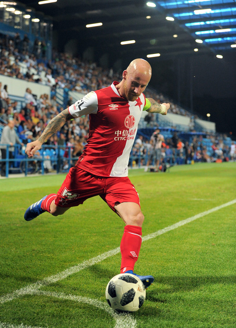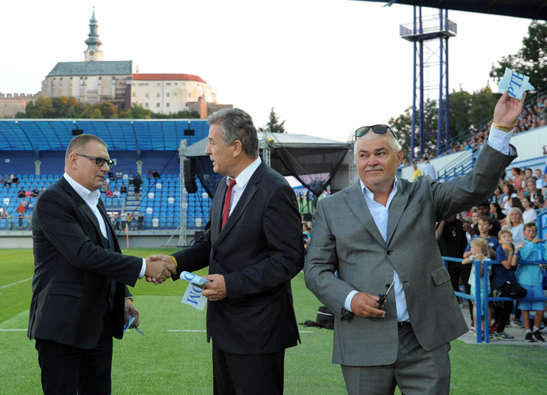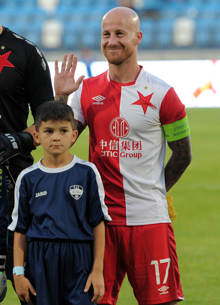 Miroslav Stoch v drese SK Slávia Praha (uprostred) pred slávnostným zápasom medzi FC Nitra - SK Slávia Praha. Nitra, 7.9 2018. Foto: SITA/Martin Havran.