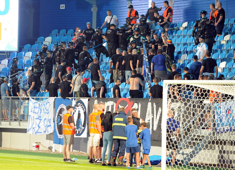 Zásah polície v sektore domácich fanúšikov počas zápasu medzi FC Nitra - SK Slávia Praha. Foto: SITA/Martin Havran.