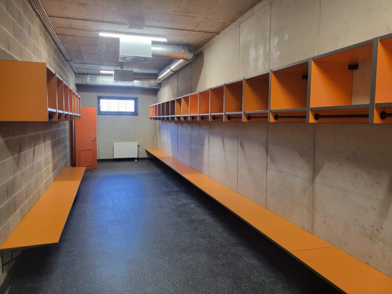 Šatňa novej skolaudovanej Šport arény v Malackách, v ktorej aktuálne dokončujú nábytky a športové vybavenie. Budovu tvoria dve časti: hokejová hala a multifunkčná hala (hádzaná, volejbal, basketbal, florbal, futsal). Súčasťou komplexu je i ubytovací trakt pre športovcov na účely sústredení, priestory pre regeneráciu, hokejový trenažér, šatne a VIP priestory. Slávnostné otvorenie je naplánované na 25. marca 2025. Malacky, 19. marec 2025. Foto: SITA/Mestský úrad Malacky