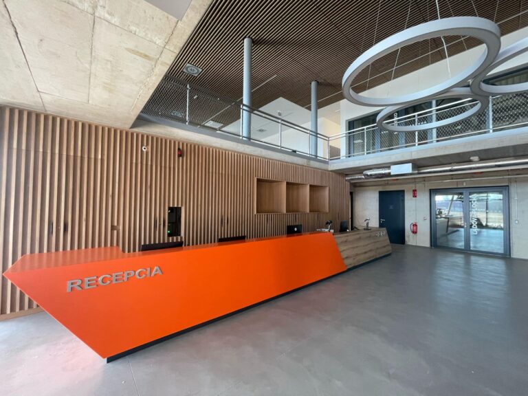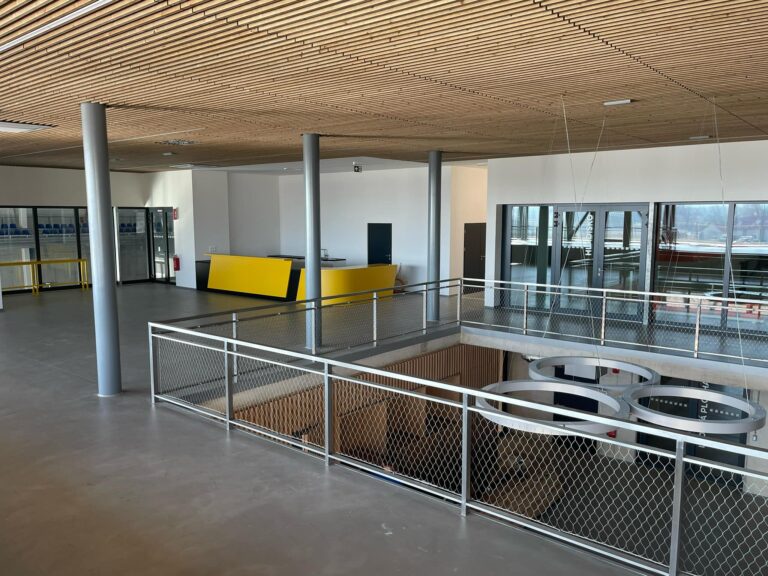 Priestor nad recepciou skolaudovanej Šport arény v Malackách, v ktorej aktuálne dokončujú nábytky a športové vybavenie. Budovu tvoria dve časti: hokejová hala a multifunkčná hala (hádzaná, volejbal, basketbal, florbal, futsal). Súčasťou komplexu je i ubytovací trakt pre športovcov na účely sústredení, priestory pre regeneráciu, hokejový trenažér, šatne a VIP priestory. Slávnostné otvorenie je naplánované na 25. marca 2025. Malacky, 19. marec 2025. Foto: SITA/Mestský úrad Malacky
