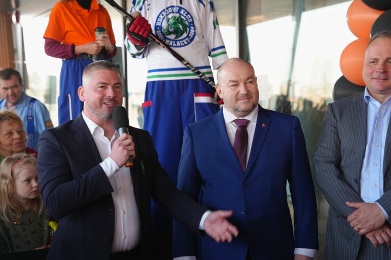 Sprava: Minister cestovného ruchu a športu SR Rudolf Huliak a primátor Malaciek Juraj Říha počas slávnostného otvorenia novej Šport arény v Malackách. Malacky, 25. marec 2025. Foto: SITA/Ministerstvo cestovného ruchu a športu SR