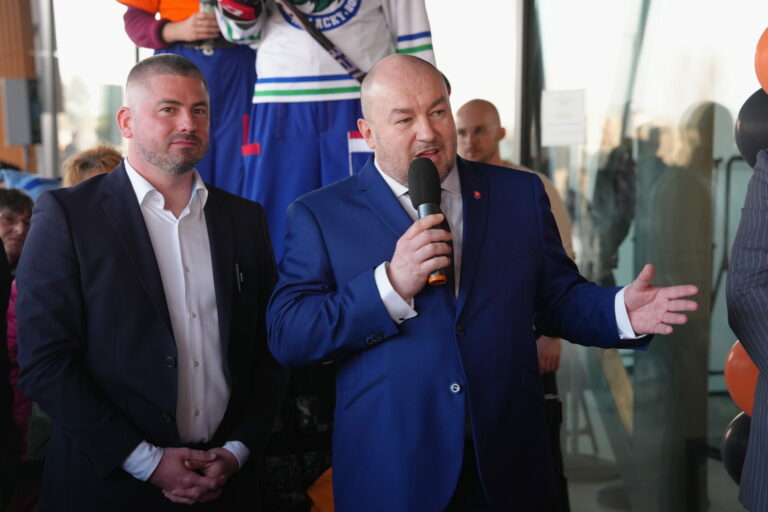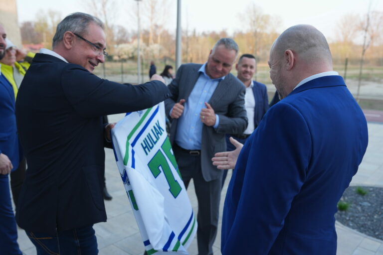 Minister cestovného ruchu a športu SR Rudolf Huliak (vpravo) počas slávnostného otvorenia novej Šport arény v Malackách. Malacky, 25. marec 2025. Foto: SITA/Ministerstvo cestovného ruchu a športu SR
