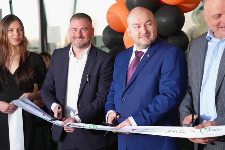 Predseda Bratislavského samosprávneho kraja Juraj Droba (vpravo), minister cestovného ruchu a športu SR Rudolf Huliak (tretí sprava) a primátor Malaciek Juraj Říha (druhý zľava) počas slávnostného otvorenia novej Šport arény v Malackách. Malacky, 25. marec 2025. Foto: SITA/Ministerstvo cestovného ruchu a športu SR