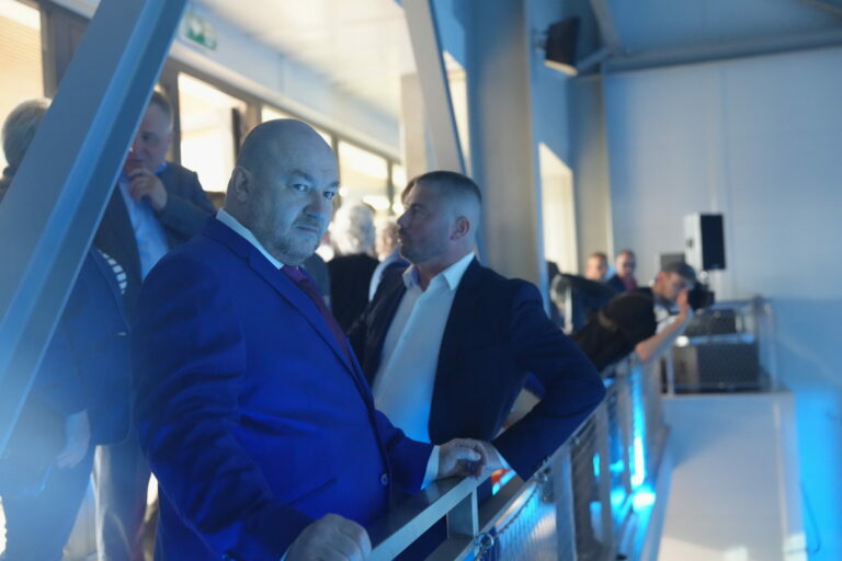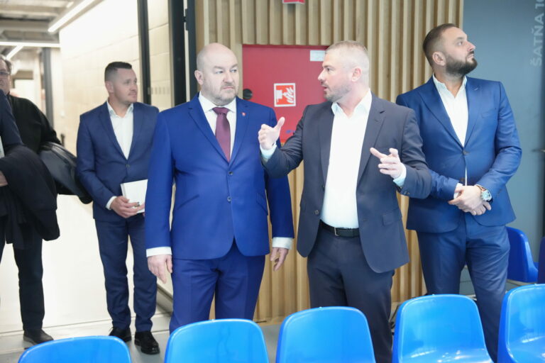 Zľava v popredí: Minister cestovného ruchu a športu SR Rudolf Huliak a primátor Malaciek Juraj Říha počas slávnostného otvorenia novej Šport arény v Malackách. Malacky, 25. marec 2025. Foto: SITA/Ministerstvo cestovného ruchu a športu SR