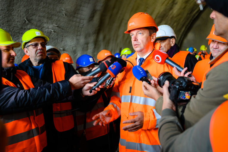 Atmosféra pri západnom portáli tunela počas slávnostného prerazenia tunela Čebrať, ktorý je súčasťou stavby D1 Hubová - Ivachnová. Hubová, 15. november 2022. Foto: SITA/Milo Fabian