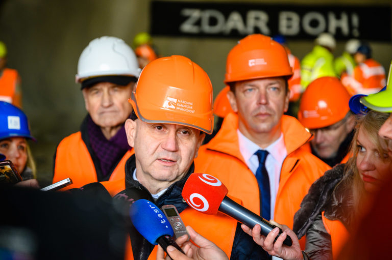 Účastníci pri západnom portáli tunela počas slávnostného prerazenia tunela Čebrať, ktorý je súčasťou stavby D1 Hubová - Ivachnová. Hubová, 15. november 2022. Foto: SITA/Milo Fabian