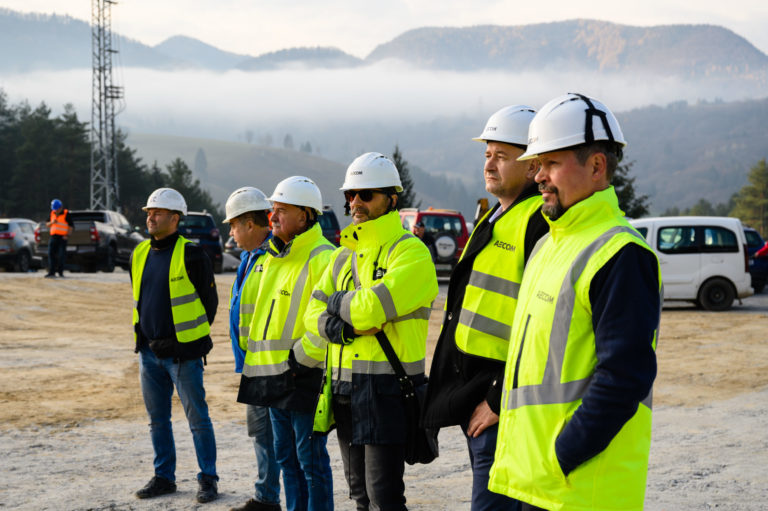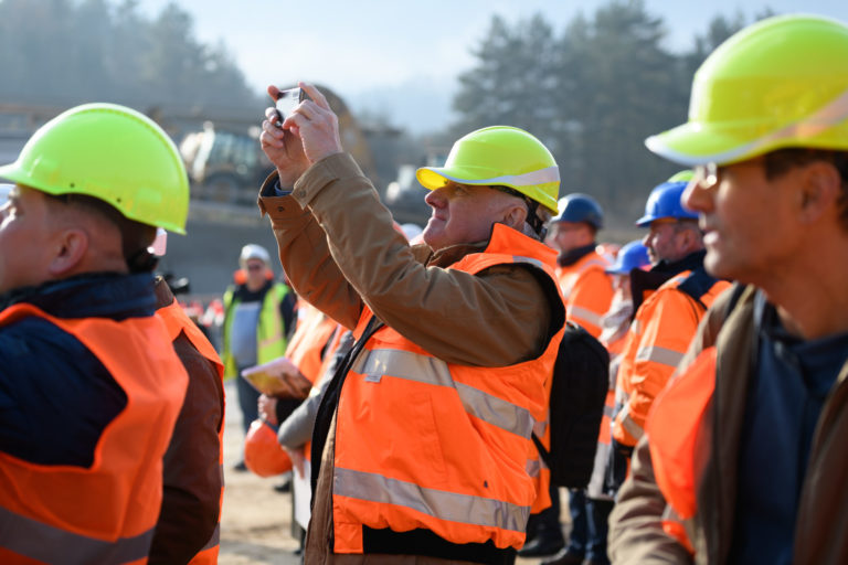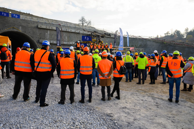 Účastníci pri západnom portáli tunela Čebrať počas slávnostného prerazenia tunela, ktorý je súčasťou stavby D1 Hubová - Ivachnová. Hubová, 15. november 2022. Foto: SITA/Milo Fabian