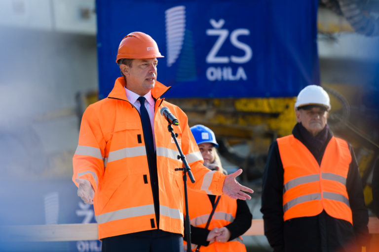 Zľava: Minister dopravy a výstavby SR Andrej Doležal, predsedníčka Žilinského samosprávneho kraja (ŽSK) Erika Jurinová a primátor mesta Ružomberok Igor Čombor v príhovore pri západnom portáli tunela Čebrať pri príležitosti slávnostného prerazenia tunela, ktorý je súčasťou stavby D1 Hubová - Ivachnová. Hubová, 15. november 2022. Foto: SITA/Milo Fabian