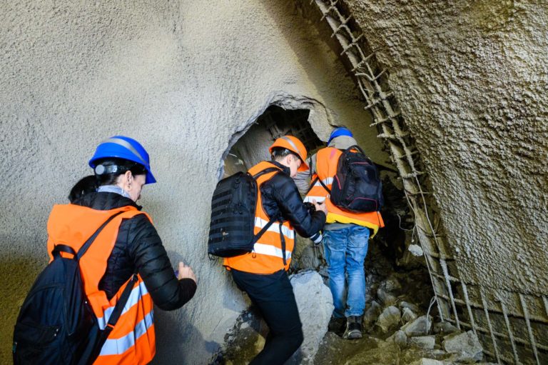 Novinári vchádzajú do prerazeného otvoru počas slávnostného prerazenia tunela Čebrať, ktorý je súčasťou stavby D1 Hubová - Ivachnová. Hubová, 15. november 2022. Foto: SITA/Milo Fabian