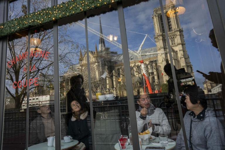 Zákazníci sedia v reštaurácii vedľa ikonickej francúzskej katedrály Notre Dame, niekoľko hodín pred jej oficiálnym znovuotvorením po prvýkrát od ničivého požiaru, v sobotu 7. decembra 2024 v Paríži. Foto: SITA/AP