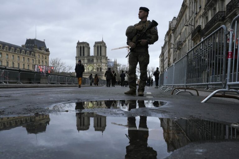 Vojak hliadkuje pri ikonickej francúzskej katedrále Notre Dame v sobotu 7. decembra 2024 v Paríži pred jej oficiálnym znovuotvorením po prvý raz od ničivého požiaru, ktorý 861-ročnú pamiatku takmer zničil v roku 2019. Foto: SITA/AP