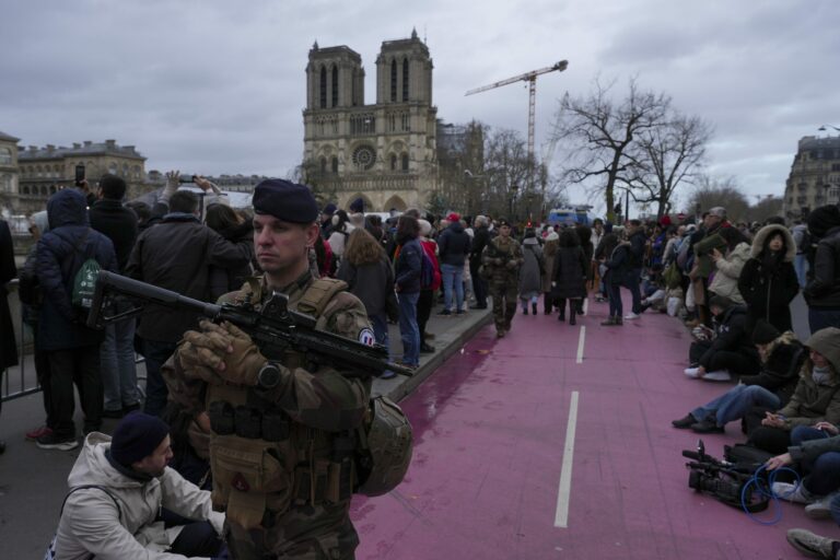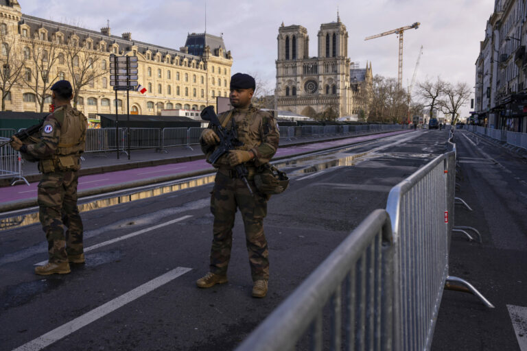 Vojaci hliadkujú pri ikonickej francúzskej katedrále Notre Dame v sobotu 7. decembra 2024 v Paríži pred jej oficiálnym znovuotvorením po prvý raz od ničivého požiaru. Foto: SITA/AP