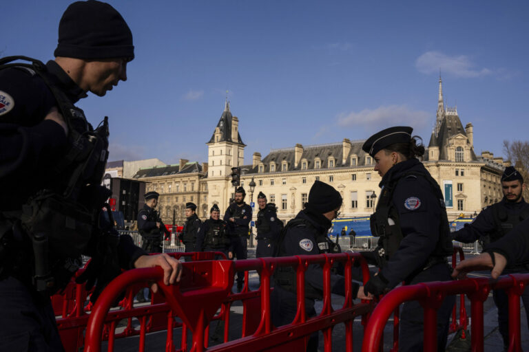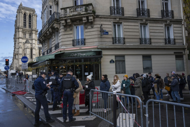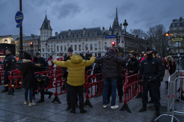 Francúzska polícia vykonáva bezpečnostné kontroly chodcov v blízkosti ikonickej francúzskej katedrály Notre Dame niekoľko hodín pred jej slávnostným znovuotvorením po prvýkrát od ničivého požiaru, v sobotu 7. decembra 2024 v Paríži. Foto: SITA/AP