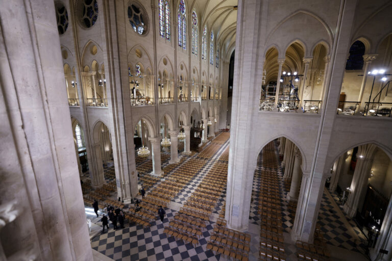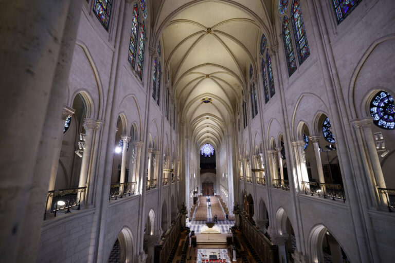 Pohľad na interiér katedrály Notre Dame pred oficiálnym znovuotvorením ikonickej francúzskej katedrály po prvýkrát od ničivého požiaru, sobota 7. decembra 2024 v Paríži. Foto: Ludovic Marin, Pool via AP