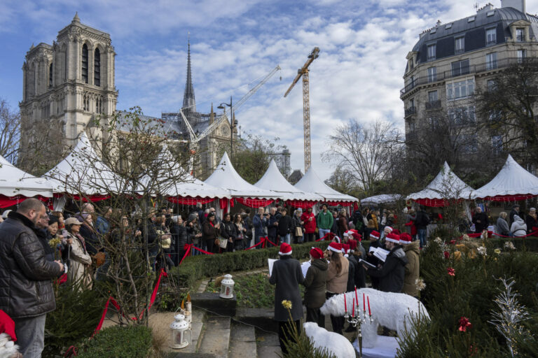 Chodci počúvajú spevácky zbor na vianočnom trhu neďaleko ikonickej francúzskej katedrály Notre Dame, niekoľko hodín pred jej oficiálnym znovuotvorením po prvýkrát od ničivého požiaru, v sobotu 7. decembra 2024 v Paríži. Foto: SITA/AP