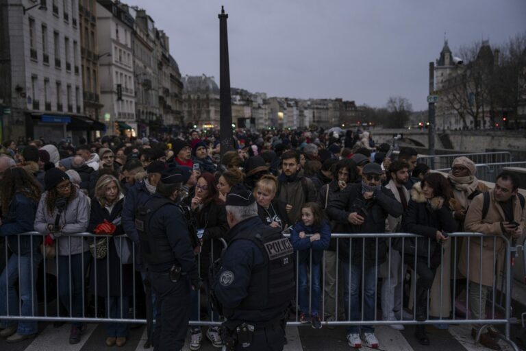 Ľudia sa zhromažďujú pri ikonickej francúzskej katedrále Notre Dame v sobotu 7. decembra 2024 v Paríži pred jej slávnostným znovuotvorením po prvý raz od ničivého požiaru, ktorý 861-ročnú pamiatku takmer zničil v roku 2019. Foto: SITA/AP