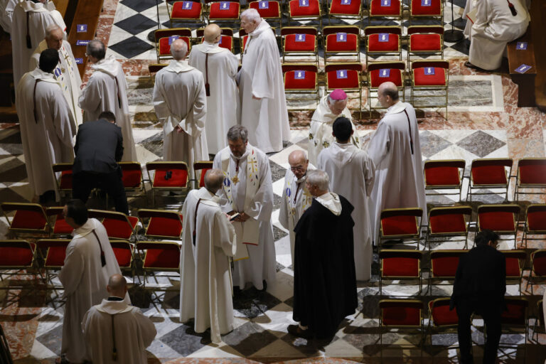 Duchovní sa zhromažďujú v katedrále Notre Dame pred oficiálnym znovuotvorením ikonickej francúzskej katedrály po prvýkrát od ničivého požiaru, sobota 7. decembra 2024 v Paríži. Foto: Ludovic Marin, Pool via AP