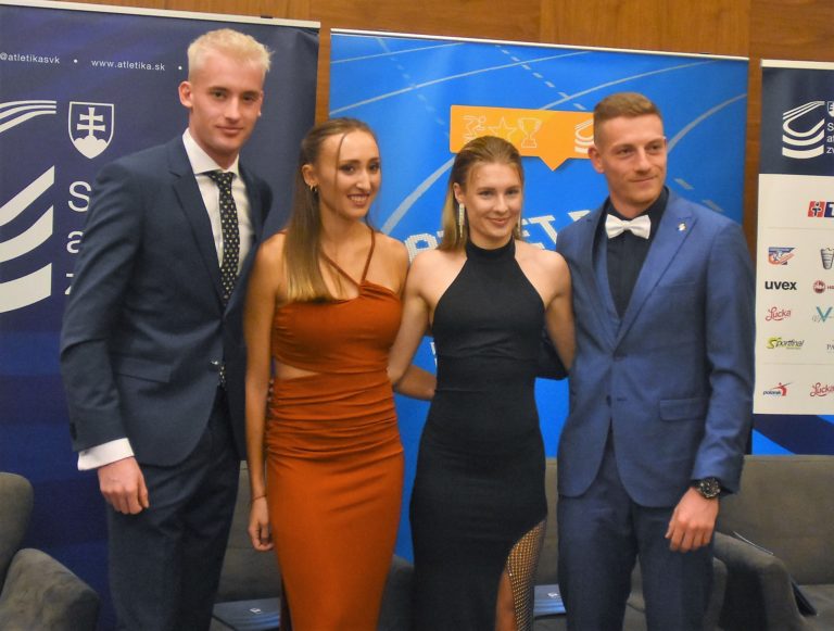 Zľava: Atléti Robert Ruffíni, Gabriela Gajanová, Viktória Forster a Ján Volko počas tlačovej besedy s laureátmi ankety pred slávnostným galavečerom Atlét roka 2023. Bratislava, 9. november 2023. Foto: SITA/Ján Luky