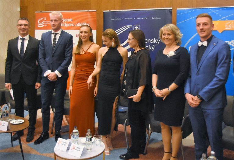 Zľava: Peter Korčok Robert Ruffíni, Gabriela Gajanová, Viktória Forster, Katarína Adlerová, Naďa Bendová a Ján Volko počas tlačovej besedy s laureátmi ankety pred slávnostným galavečerom Atlét roka 2023. Bratislava, 9. november 2023. Foto: SITA/Ján Luky