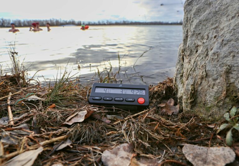 Teplota vody na Zlatých Pieskoch v Bratislave počas krstu otužilcov Ľadové Medvede Bratislava. Bratislava, 24. december 2024. Foto: SITA/Tomáš Susko.