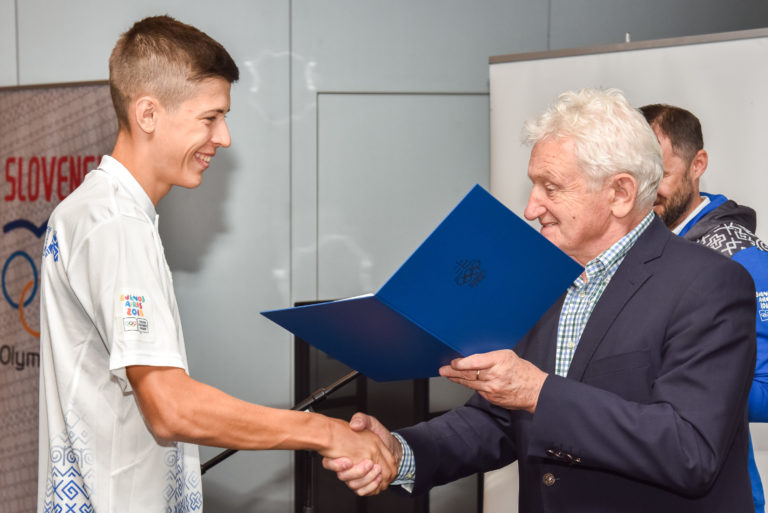 Zľava: Atlét Andrej Paulíny a čestný prezident SOV František Chmelár počas preberania menovacieho dekrétu z rúk čestného prezidenta Slovenského olympijského výboru (SOV) pred odchodom na III. olympijske hry mládeže (OHM) v argentínskom Buenos Aires. Bratislava, 1. október 2018. Foto: SITA/Diana Černáková