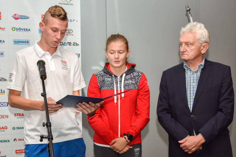 Zľava: Futsalista Matúš Ševčík, slovenská boxerka Jessica Triebeľová a čestný prezident Slovenského olympijského výboru (SOV) František Chmelár počas slávnostného sľubu členov slovenského reprezentačného tímu pred odchodom na III. olympijské hry mládeže (OHM) v argentínskom Buenos Aires. Bratislava, 1. október 2018. Foto: SITA/Diana Černáková