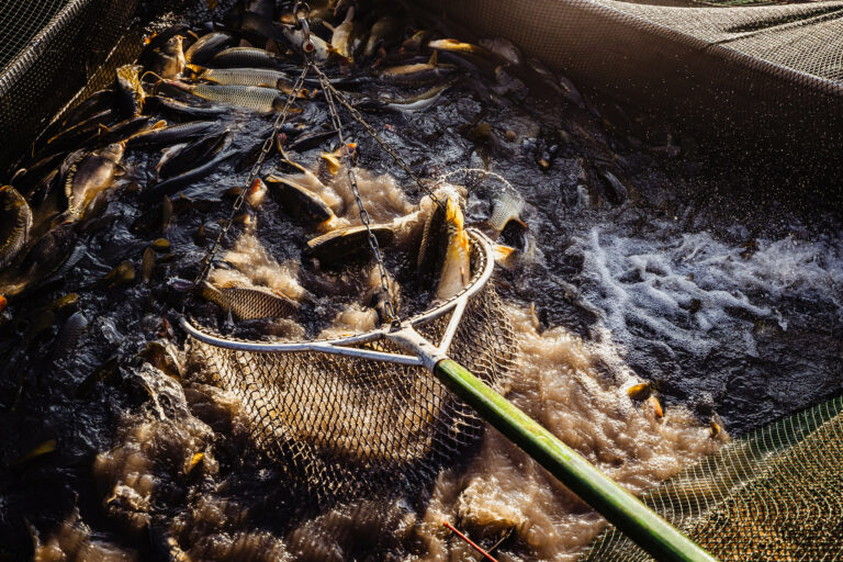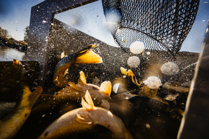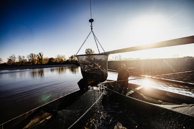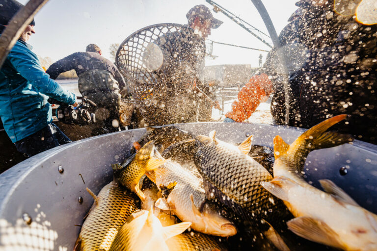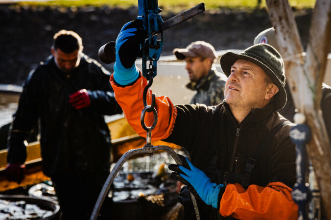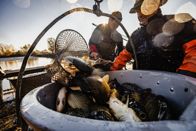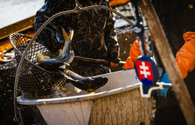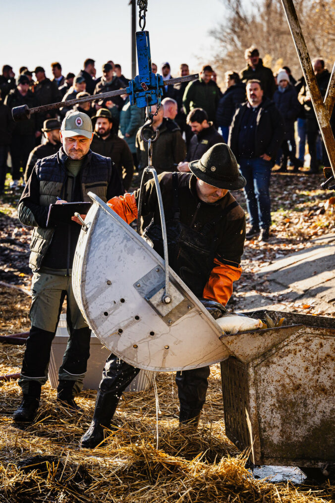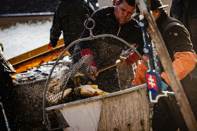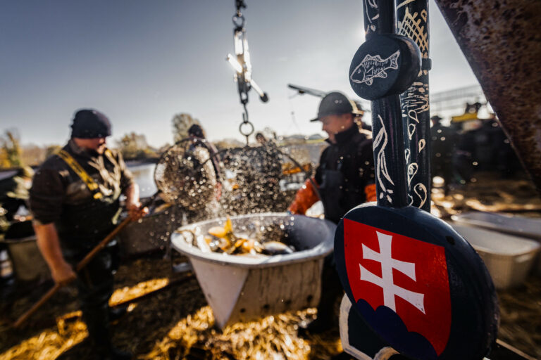 Slávnostný výlov rýb na Boheľovských rybníkoch za účasti prezidenta SR a ministra pôdohospodárstva a rozvoja vidieka symbolicky otvára obdobie blížiacich sa Vianoc. Boheľov, 7. november 2025. Foto: SITA/Kancelária prezidenta SR