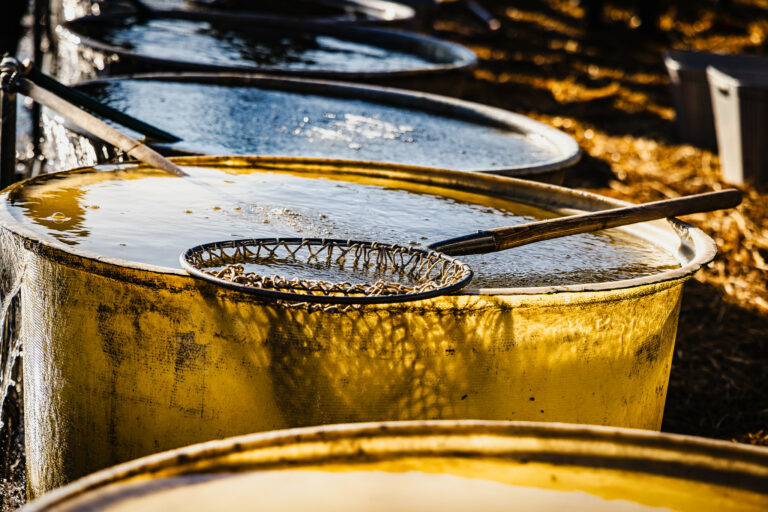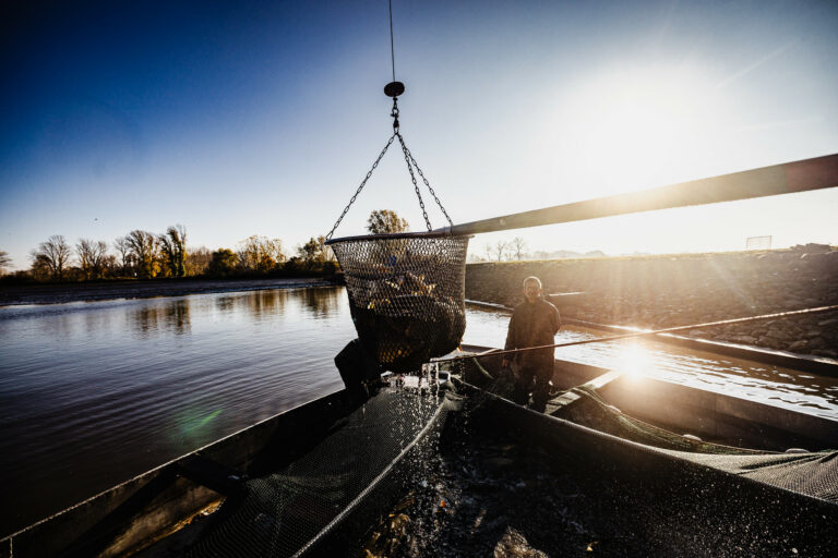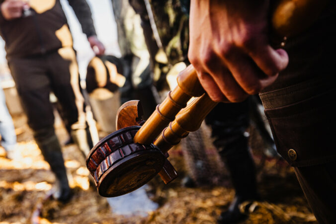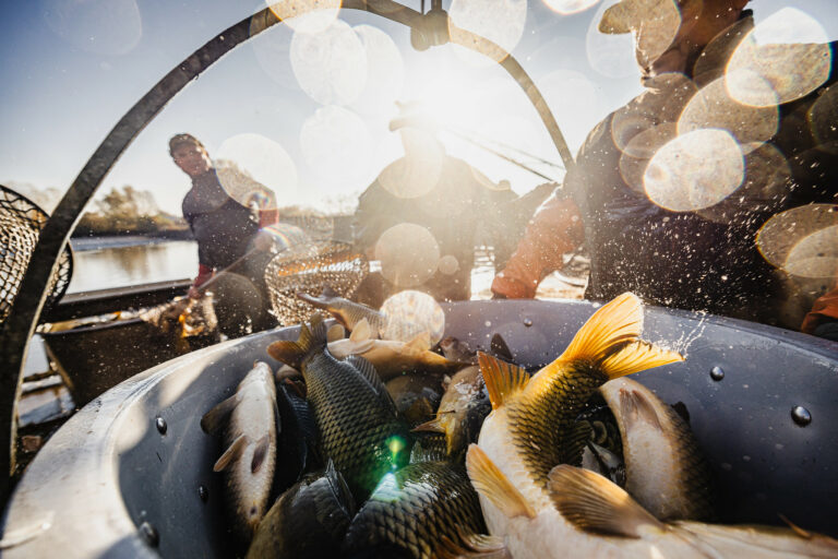 V popredí sprava: Minister pôdohospodárstva a rozvoja vidieka SR Richard Takáč a prezident SR Peter Pellegrini počas slávnostného výlovu rýb na Boheľovských rybníkoch, ktorý symbolicky otvára obdobie blížiacich sa Vianoc. Boheľov, 7. november 2025. Foto: SITA/Kancelária prezidenta SR