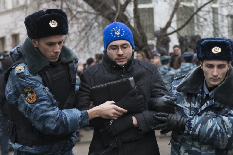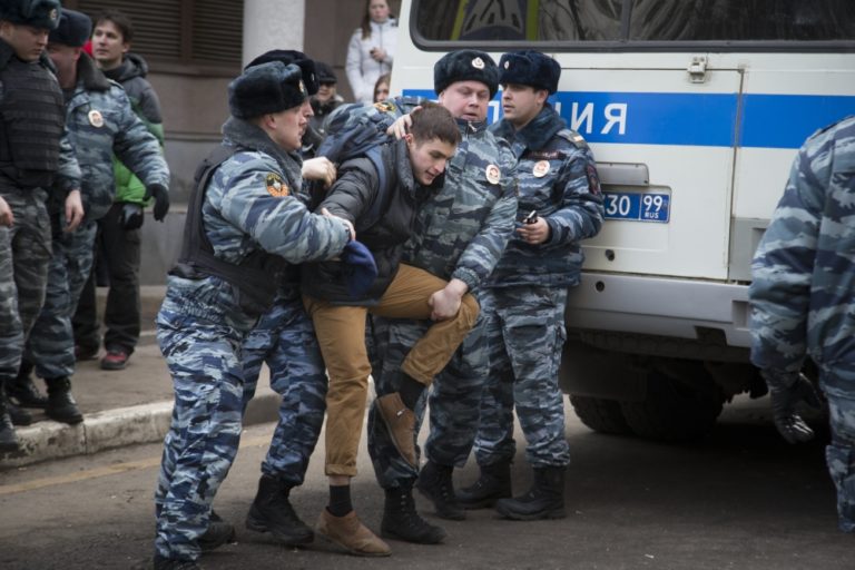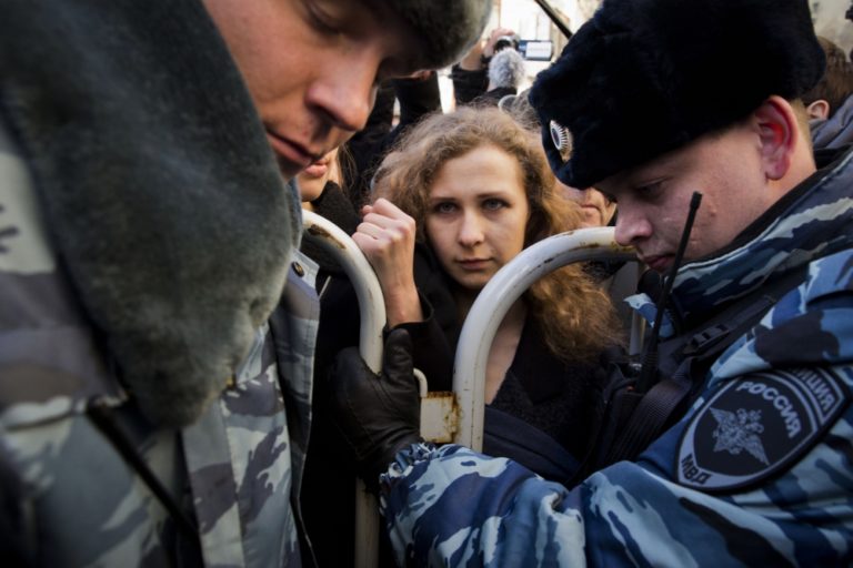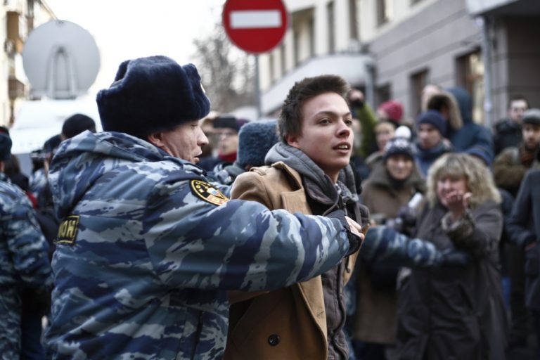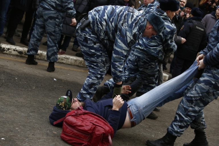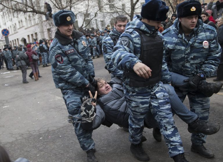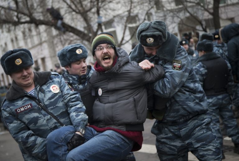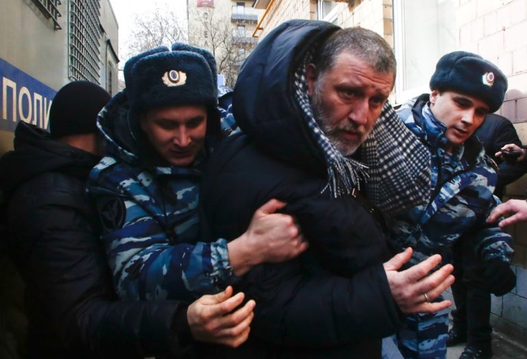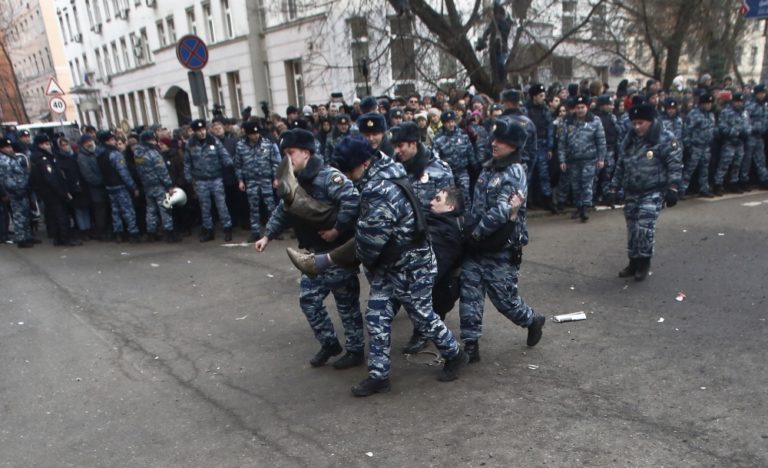V Moskve sa v piatok rozhodovalo o osude skupiny mužov, ktorí ešte v roku 2012 protestovali proti prezidentovi Putinovi. Súd ich uznal vinnými z násilností. Zatýkalo sa pre to aj v piatok. Foto: SITA/AP