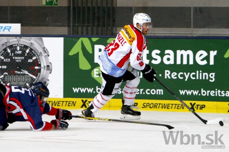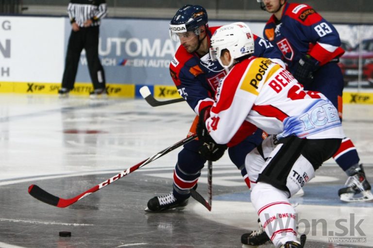 Zľava: Marek Viedenský zo Slovenska a Christoph Bertschy zo Švajčiarska počas hokejového zápasu Slovensko - Švajčiarsko na Nemeckom pohári 2014 v Mníchov. Mníchov, Nemecko, 9. november 2014. Foto: SITA/Rainer Gmach