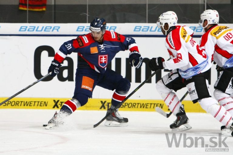 Zľava: Tomáš Marcinko zo Slovenska a Lorenz Kienzle zo Švajčiarska počas hokejového zápasu Slovensko - Švajčiarsko na Nemeckom pohári 2014 v Mníchov. Mníchov, Nemecko, 9. november 2014. Foto: SITA/Rainer Gmach