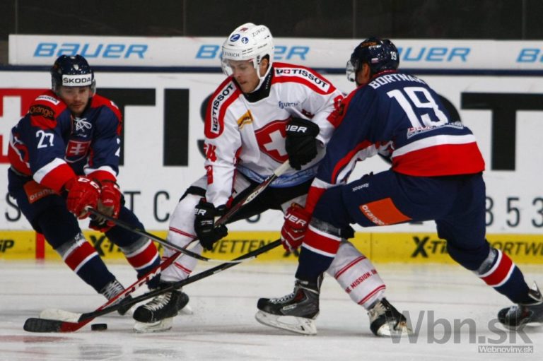 Zľava: Ratislav Dej zo Slovenska, Christoph Bertschy zo Švajčiarska a Dalibor Bortňákzo Slovenska počas hokejového zápasu Slovensko - Švajčiarsko na Nemeckom pohári 2014 v Mníchov. Mníchov, Nemecko, 9. november 2014. Foto: SITA/Rainer Gmach