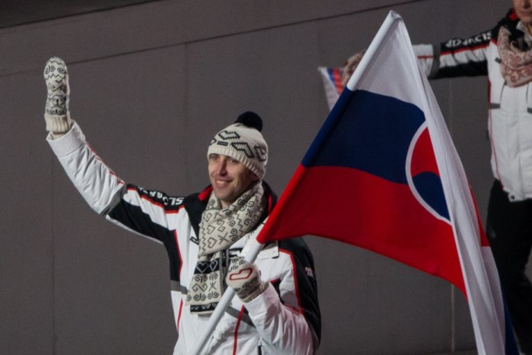Slovenský hokejový reprezentant Zdeno Chára (druhý zľava) nesie slovenskú zástavu počas otváracieho ceremoniálu ZOH 2014 v Soči. Rusko, Soči, 7. február 2014. Foto: SITA/Jozef Jakubčo