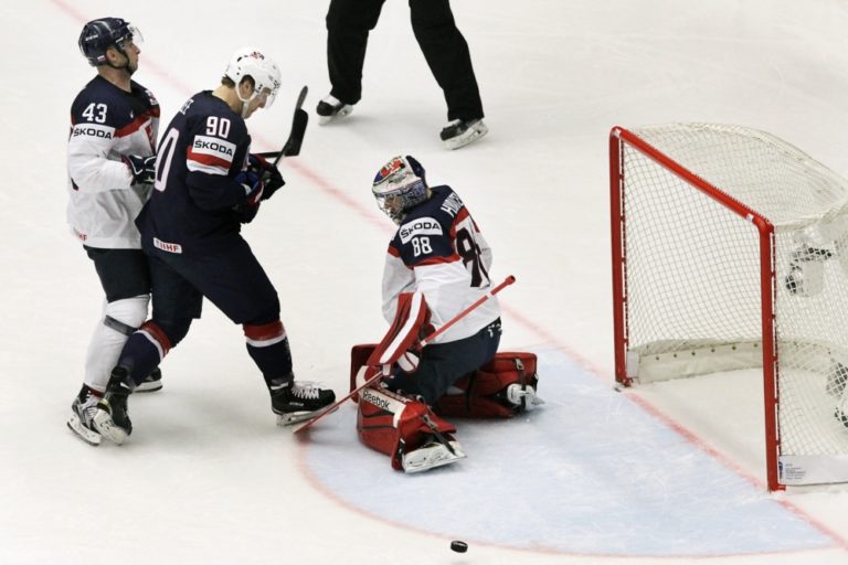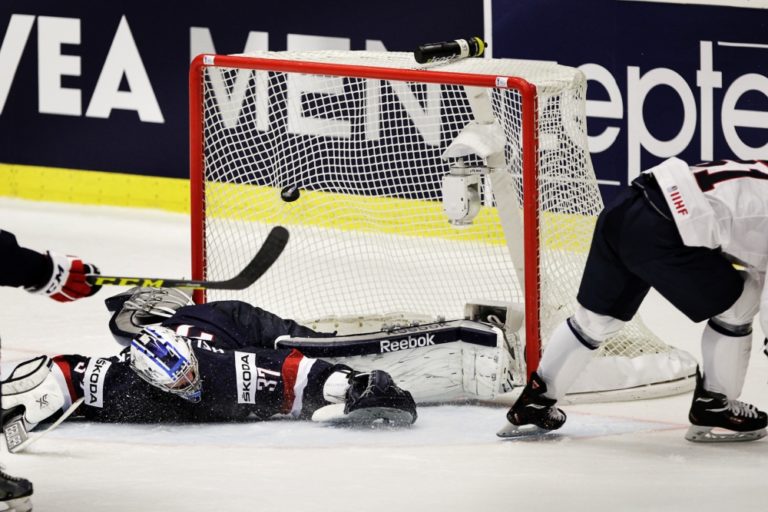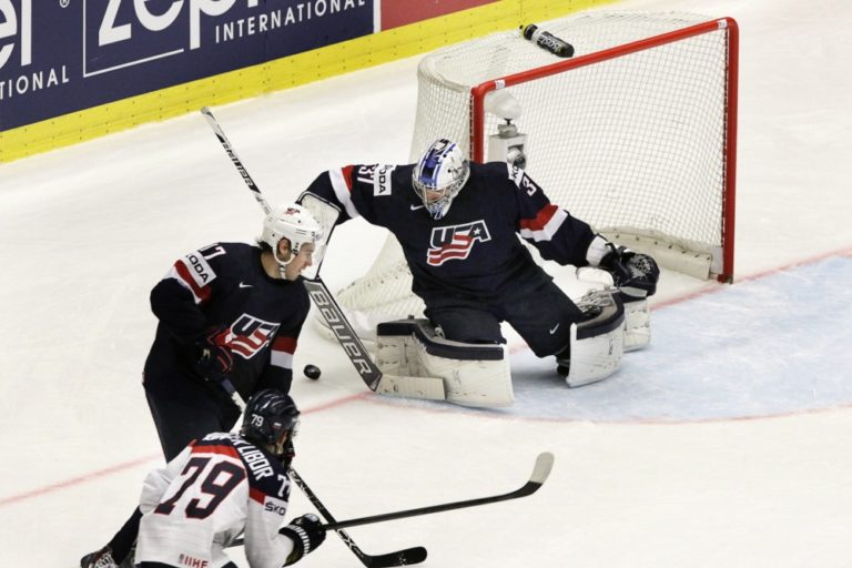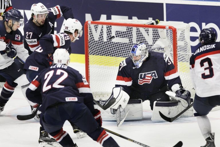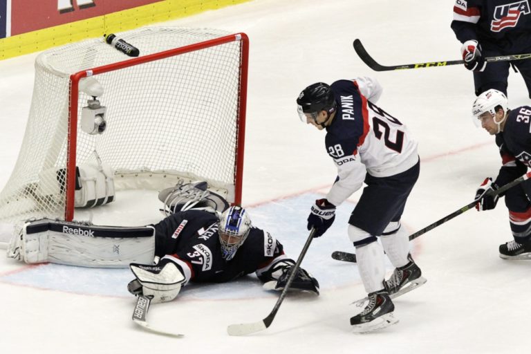 Americkí hokejisti sa smutne pozerajú ako puk z hokejky slovenského obrancu Adama Jánošíka končí za chrbtom brankára Connora Hellebuycka počas zápasu B-skupiny na svetovom šampionáte v Česku. Ostrava, 12. máj 2015. Foto: SITA/Ján Viazanička