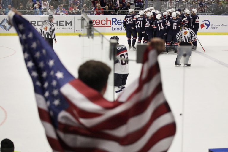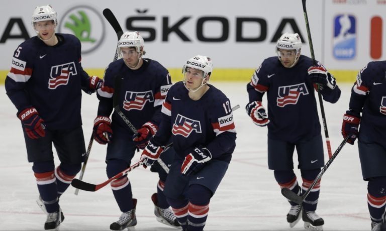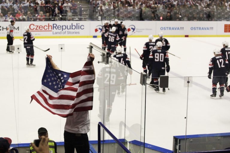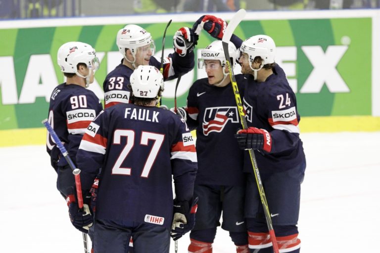 Radosť amerických hokejistov po triumfe nad Slovenskom po zápase B-skupiny na svetovom šampionáte v Česku. Ostrava, 12. máj 2015. Foto: SITA/Ján Viazanička