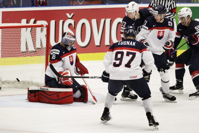 Slovenský útočník Richard Pánik sa snaží prekonať amerického brankára Connora Hellebuycka počas zápasu B-skupiny na svetovom šampionáte v Česku. Ostrava, 12. máj 2015. Foto: SITA/Ján Viazanička