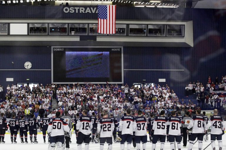 Slovenskí a americkí hokejisti po zápase B-skupiny na svetovom šampionáte v Česku. Ostrava, 12. máj 2015. Foto: SITA/Ján Viazanička