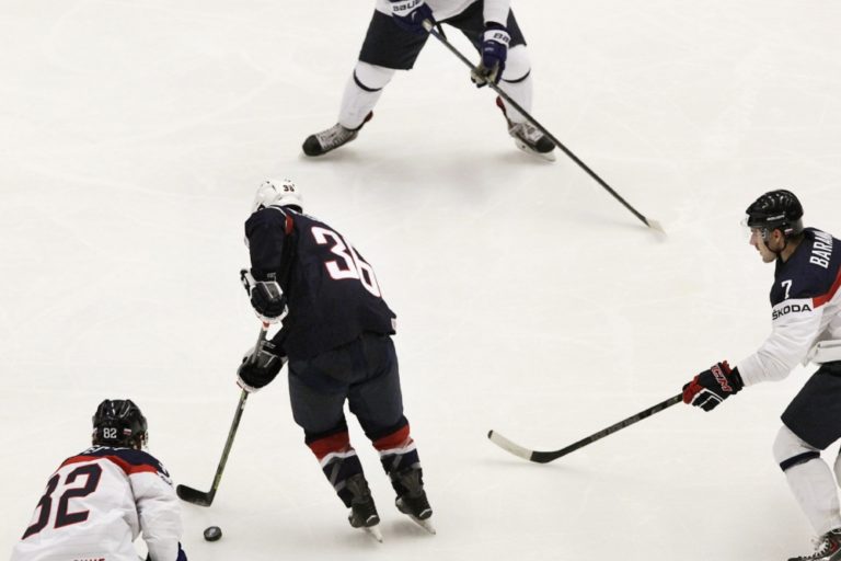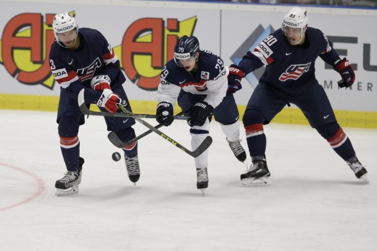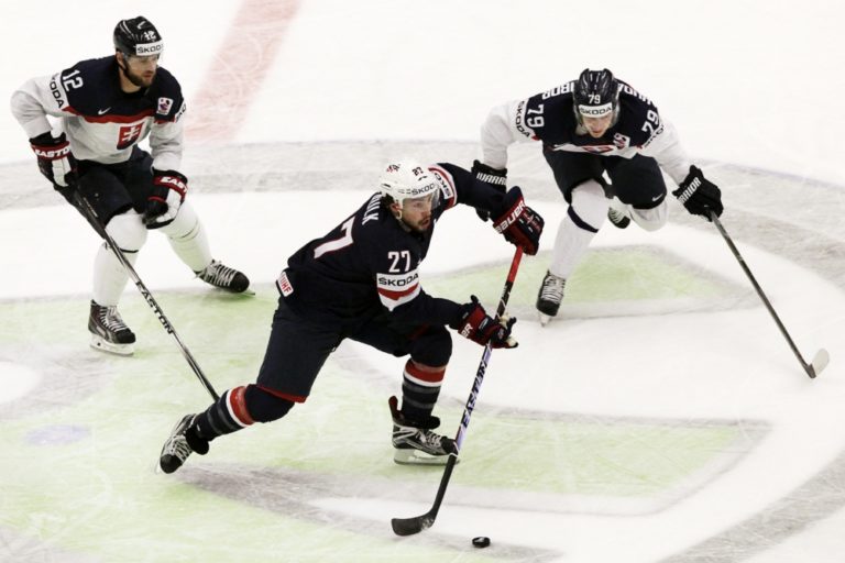 Američania Seth Jones a Anders Lee v súboji so slovenským útočník Liborom Hudáčkom počas zápasu B-skupiny na svetovom šampionáte v Česku. Ostrava, 12. máj 2015. Foto: SITA/AP