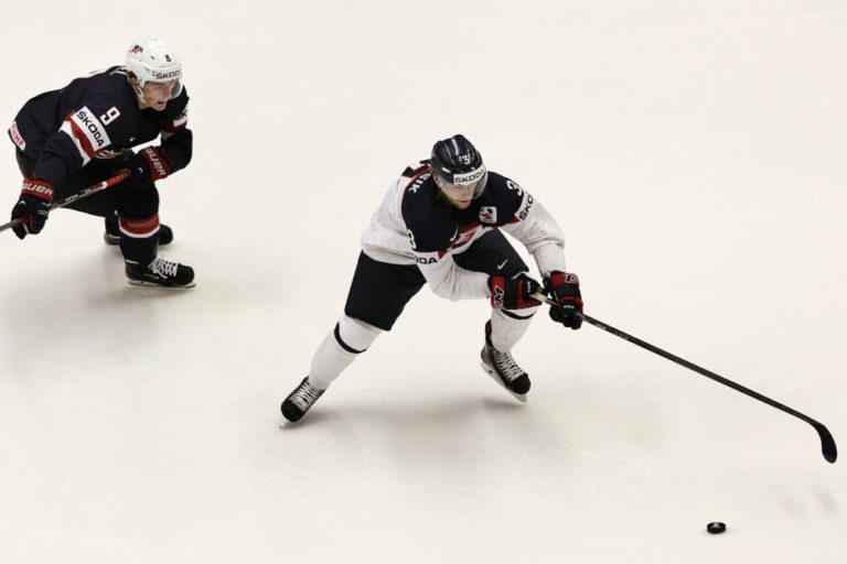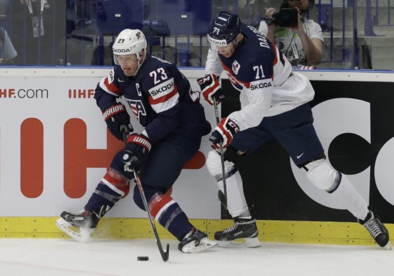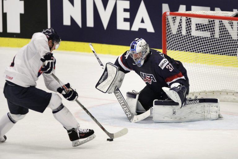 Americký útočník Ben Smith sleduje zákrok brankára Connora Hellebuycka počas zápasu B-skupiny na svetovom šampionáte v Česku. Ostrava, 12. máj 2015. Foto: SITA/Ján Viazanička