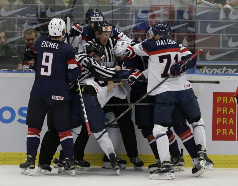 Šarvátka medzi slovenskými a americkými hokejistami počas zápasu B-skupiny na svetovom šampionáte v Česku. Ostrava, 12. máj 2015. Foto: SITA/AP