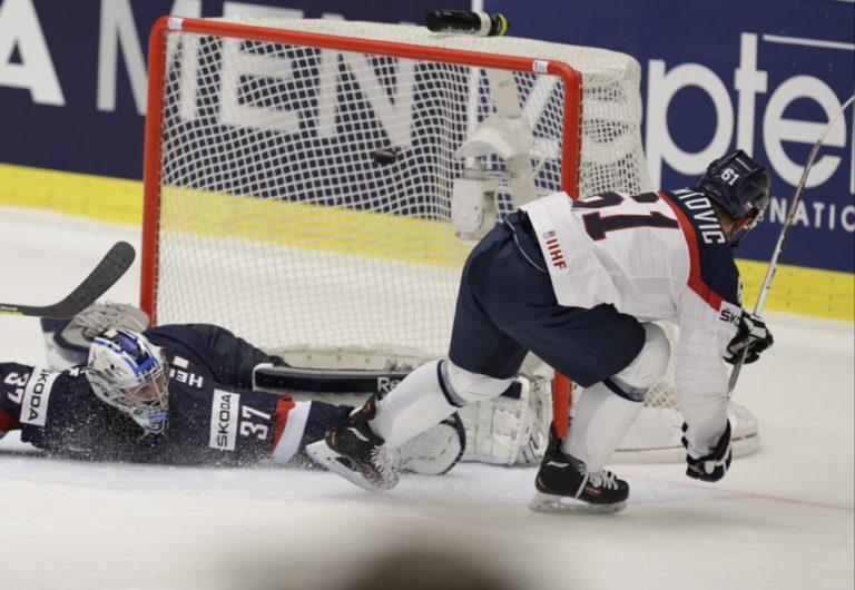 Slovenský útočník Milan Bartovič prekonáva amerického brankára Connora Hellebuycka počas zápasu B-skupiny na svetovom šampionáte v Česku. Ostrava, 12. máj 2015. Foto: SITA/AP
