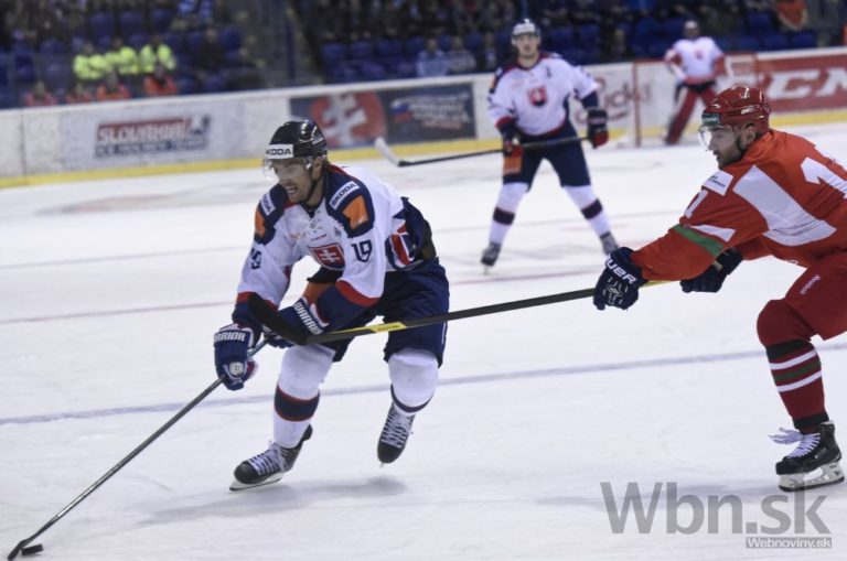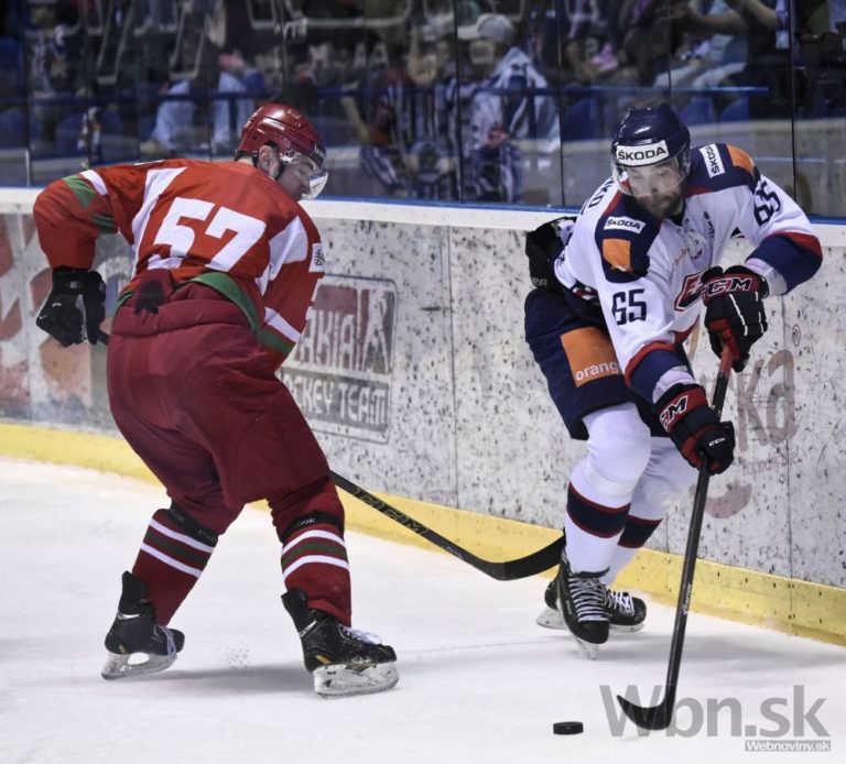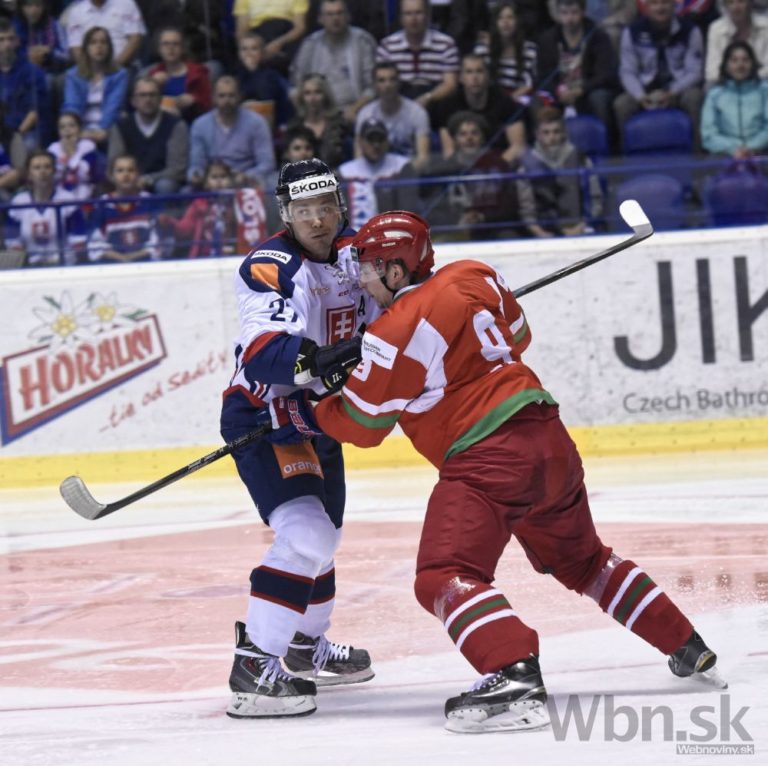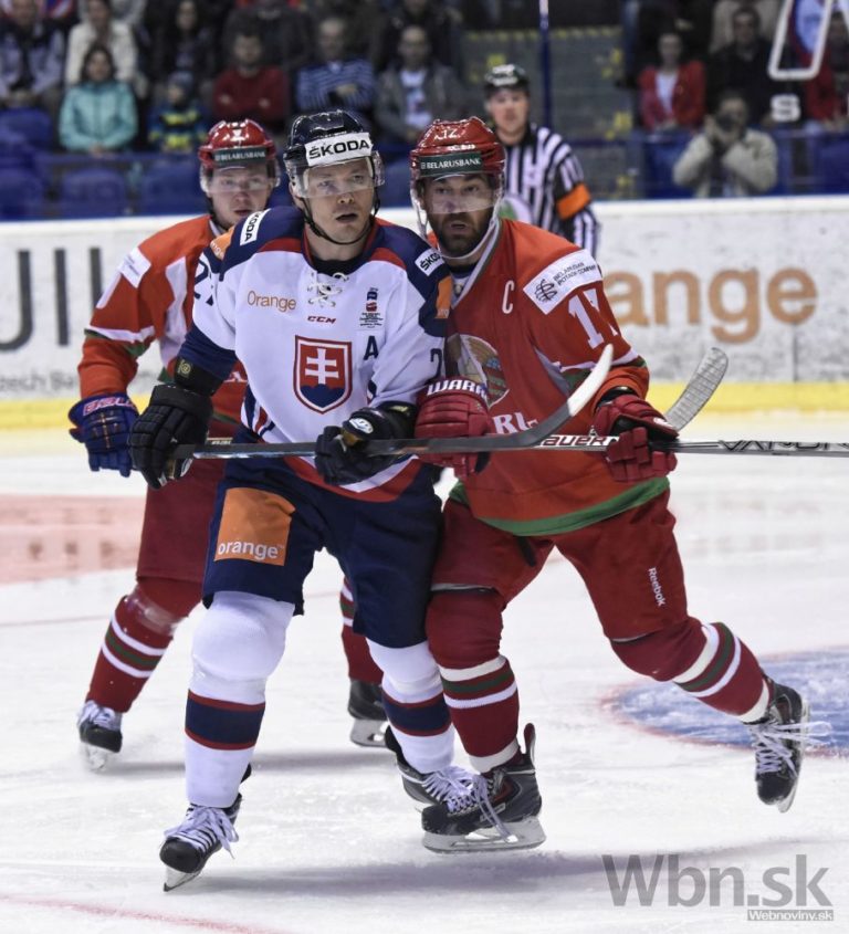 Bielorus Aleksannder Kulakov v súboji so slovenským útočníkom Michelom Miklíkom počas zápasu Euro Hockey Challenge. Košice, 16. apríl 2015. Foto: SITA/Ivan Fleischer
