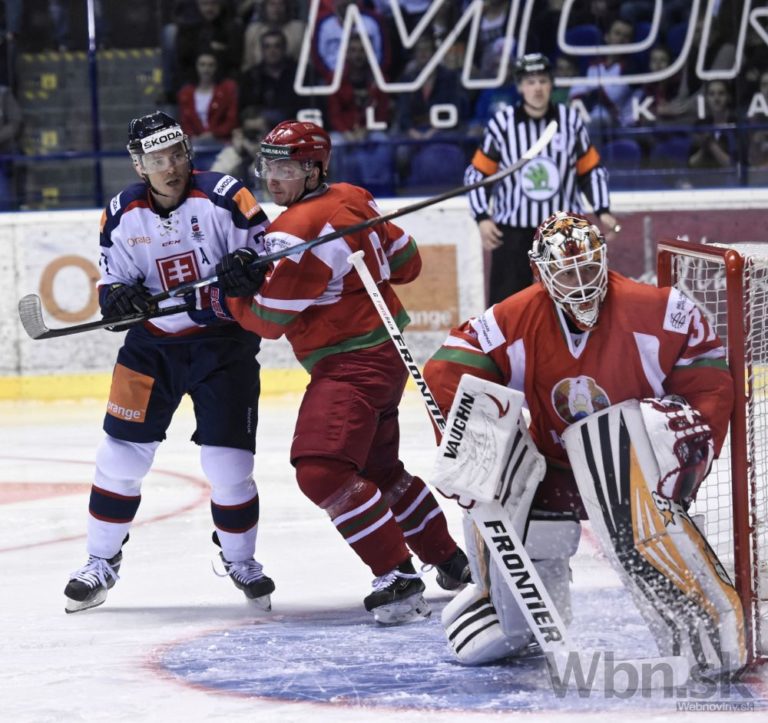 Bielorus Andrej Karev v súboji so slovenským útočníkom Ladislavom Nagyom pred brankárom Igorom Brikunom počas zápasu Euro Hockey Challenge. Košice, 16. apríl 2015. Foto: SITA/Ivan Fleischer