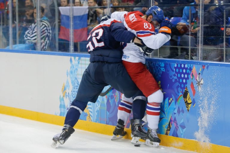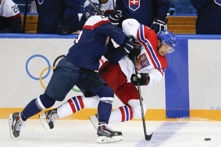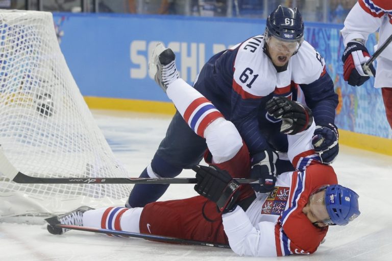 Slovenský útočník Milan Bartovič v súboji s Čechom Milanom Michálkom počas utorňajšieho zápasu o postup do štvrťfinále olympijského turnaja v Soči. Foto: SITA/AP