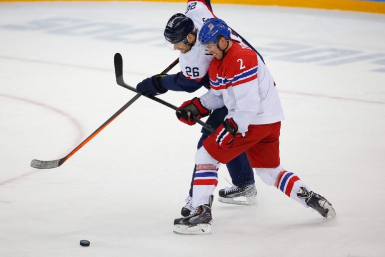 Súboj slovenského obrancu Martina Marinčina s českým útočníkom Alešom Hemským počas zápasu o postup do štvrťfinále na olympijskom hokejovom turnaji. Foto: SITA/AP